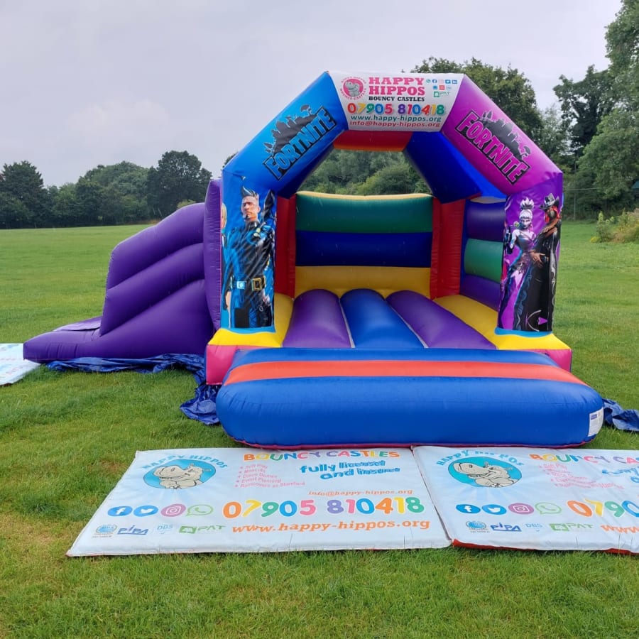 Our amazing Fortnite Slide themed bouncy castle is lovely with bright & vibrant colours. The Fortnite Slide Bouncy Castle has proven to be very popular this year. This castle can also come with soft play & a matching themed ball pit.
