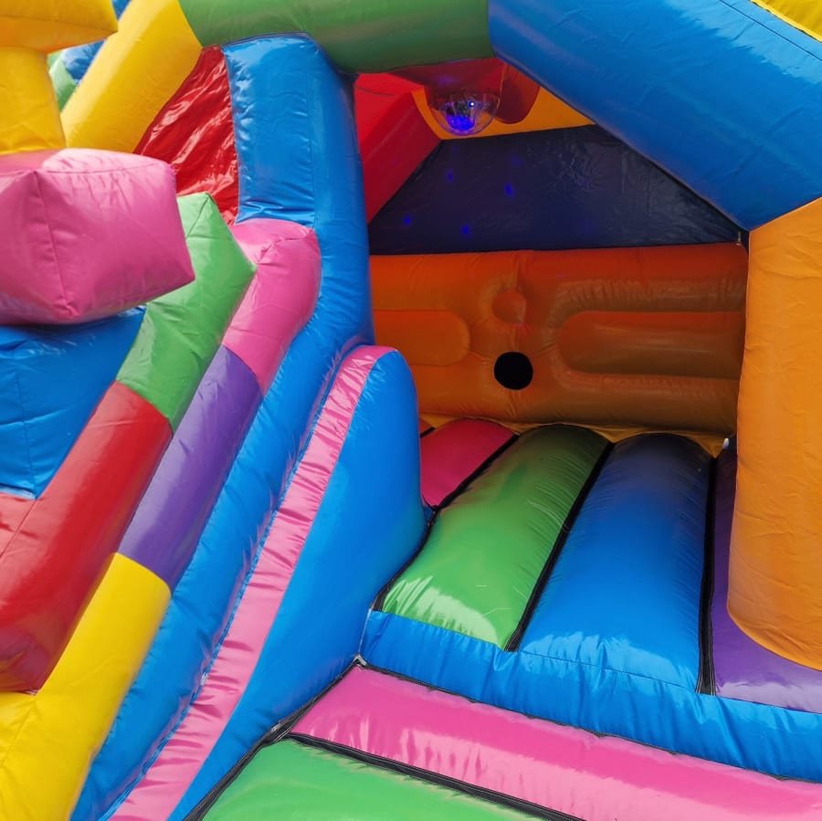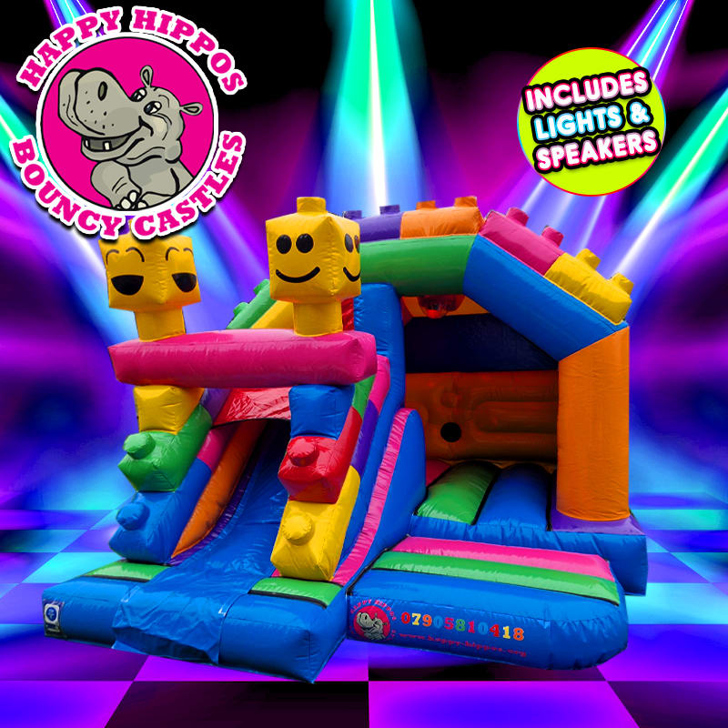 Our fantastic Lego Disco 3D Slide Bouncy Castle is the ultimate experience.