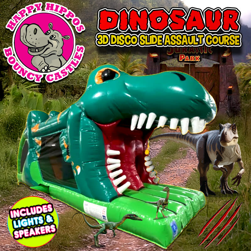The New Dinosaur 3d Disco Slide Assault Course is here to take your event or party to the next level! This enormous 30ft 3d Dino is a true showstopper, standing tall and commanding attention at any gathering. With intricate 3D detailing, users will embark on a challenging adventure through the course, complete with bish bashes and an exhilarating 5.6ftt slide. Also included is disco lights & a speaker pre loaded with over 350 of the latest songs!