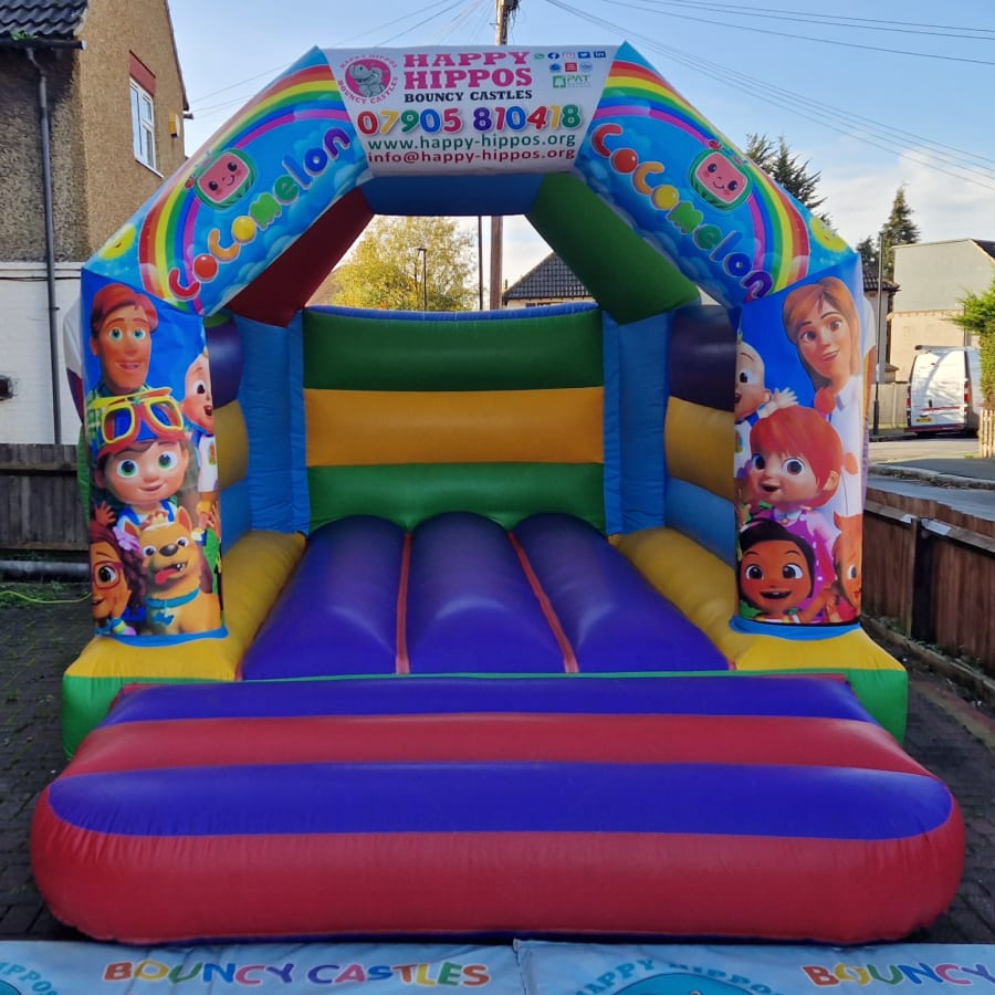 Our exciting Cocomelon themed bouncy castle is lovely with bright, vibrant colours. The Cocomelon Bouncy Castle has proven to be very popular this year. This castle can also come with soft play & a matching themed ball pit.
