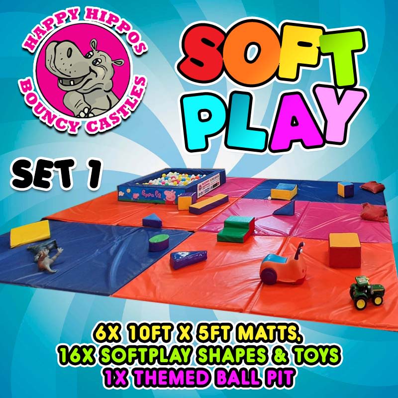 Our fantastic Soft Play Set 1 consists of x6 (10ftx5ft) multi coloured matts, x16 toys & shapes & a 5ft x5ft ball pit which has an astonishing 33 different themes to choose from at no extra cost including Disney, Cocomelon, Unicorn, Paw Patrol....Please add the theme you would like to book on the booking form. The 6 matts are 10ft x 5ft & can be arranged to fit various spaces & have a maximum area of 300 square feet!