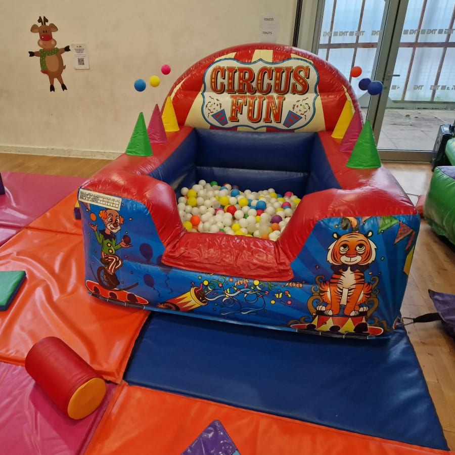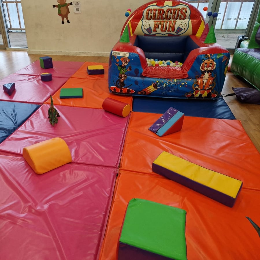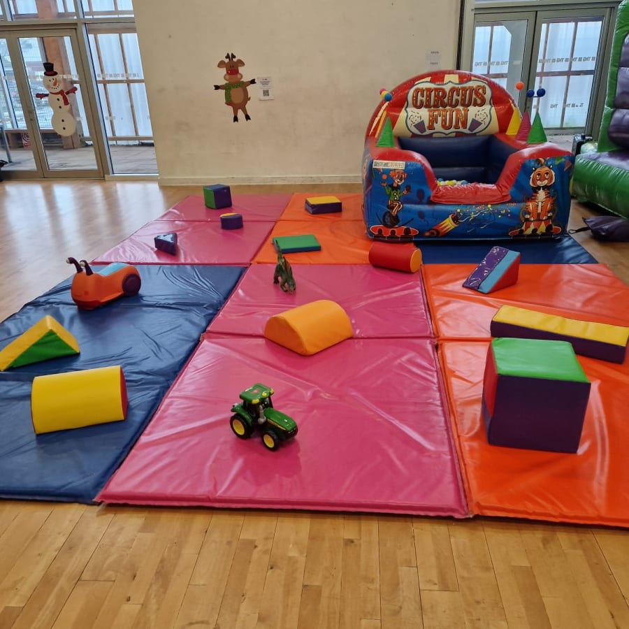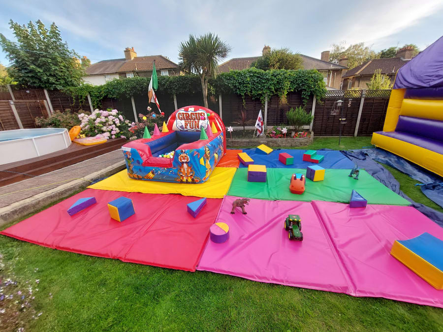 Our fantastic Soft Play Set 2 consists of x6 (10ftx5ft) multi coloured matts, x16 toys & shapes & an amazing 7ft x 6ft Air Juggler! The 6 matts are 10ft x 5ft & can be arranged to fit various spaces & have a maximum area of 300 square feet!