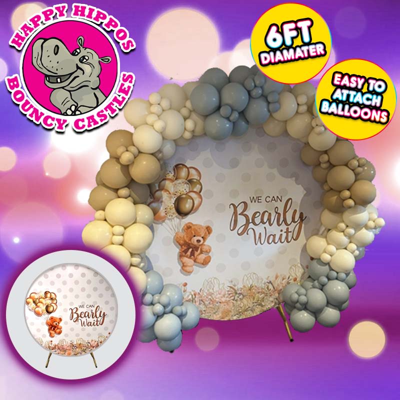 Our new Babyshower Round Backdrop is set on a Gold Coloured 6ft diameter round balloon arch. Please note the hire is for the balloon round backdrop cover & vballoon arch only (not balloons). You can eaily attach your own balloons or add a professional display. Included within the price is x2 10kg matching gold coloured weights to prevent the display from toppeling over.