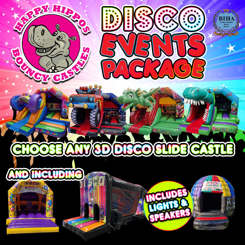 Please note that If the equipment is over 40m from the venue then a generator will also need to be hired & you will need to hire this package - https://happy-hippos.org/packages/15/disco-events-package-with-generator-saving-50. Extension leads will have to run from 4 seperate plug sockets (1 for each castle) to avoid overloading of power & tripping the electrics.